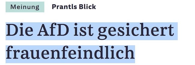 „Gesichert frauenfeindlich“ ist die AfD aus Sicht von Heribert Prantl (Süddeutsche Zeitung), weil „diese Partei all das ablehnt, wofür die verstorbene CDU-Politikerin Rita Süssmuth gekämpft hat und wofür sie in einem Trauerstaatsakt gewürdigt wurde: Emanzipation, Frauenförderung, Gleichberechtigung, Gleichstellung“. Quelle: siehe 3