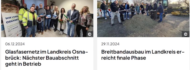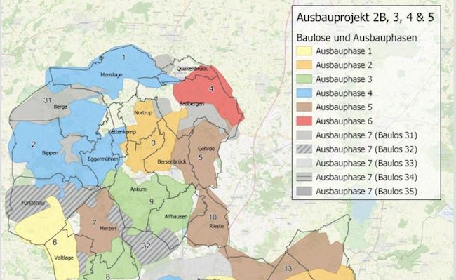 Nov. 2024: Mit der siebten und letzten Bauphase der sogenannten „Weißen Flecken“ wird bis Ende 2025 der Ausbau in unterversorgten und zersiedelten Gebieten des Landkreises abgeschlossen. Dabei entstehen rund 337 Kilometer Glasfasertrasse, die 1.100 Hausanschlüsse ermöglichen. https://www.landkreis-osnabrueck.de/presse/ps-breitband