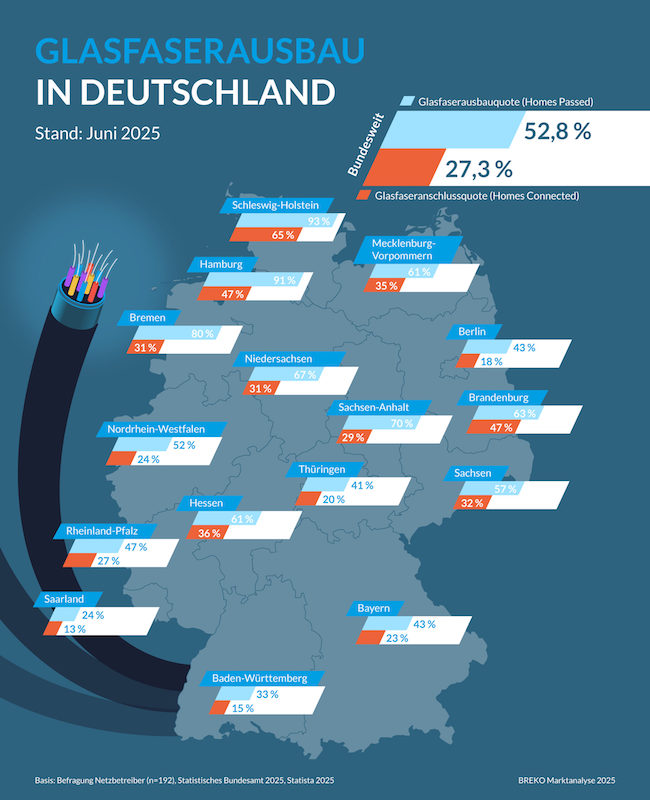 Das sind die neusten Glasfaser-Zahlen des Bundesverbands Breitbandkommunikation (BREKO). Und zwar jeweils zur Glasfaser-Ausbauquote sowie zur Glasfaser-Anschlussquote (mit Glasfaser angeschlossene Haushalte, Unternehmen usw.). Quelle und ©: