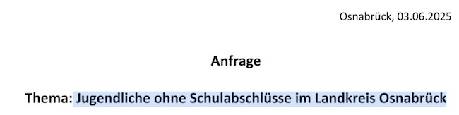 Eine der beiden SPD/UWG-Anfragen zu unseren Schulen brachte ans Licht, dass auch im Landkreis Osnabrück die Zahl der Jugendlichen ohne Schulabschluss in den letzten Jahren in besorgniserregendem Ausmaß gestiegen ist. Und zwar von 6,3 % im Jahr 2019 auf 9,6 % im Jahr 2024 (Anteil Abgänge ohne mind. Hauptschulabschluss). Das ist alarmierend mit Blick auf die Zukunftsperspektiven dieser jungen Menschen. Sie haben oft nur geringe Chancen, einen Ausbildungsplatz zu finden, und auch das Risiko, arbeitslos zu werden, steigt.
