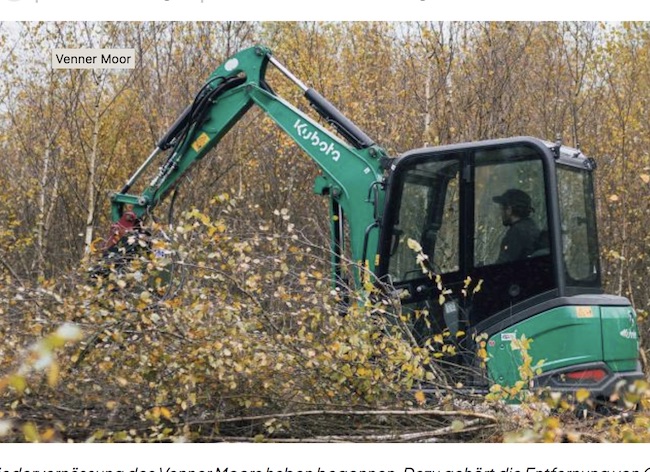 Im Venner Moor werden derzeit auf einer Fläche von 7,6 ha Entkusselungsarbeiten durchgeführt, womit gemeint ist, dass Gehölze und Sträucher entfernt werden, damit wieder offene, lichtdurchflutete Flächen entstehen. Dort können sich dann typische Moorpflanzen wie Torfmoose ansiedeln. „Sie bilden die Grundlage dafür, dass Kohlenstoff langfristig im Boden gespeichert bleibt“, so der Landkreis in seiner Pressemitteilung. Dieser weitere Schritt schließt an die Arbeiten in den vergangenen Jahren an wie z.B. den Rückbau von Entwässerungsgräben und die Wiederherstellung natürlicher Wasserstände.